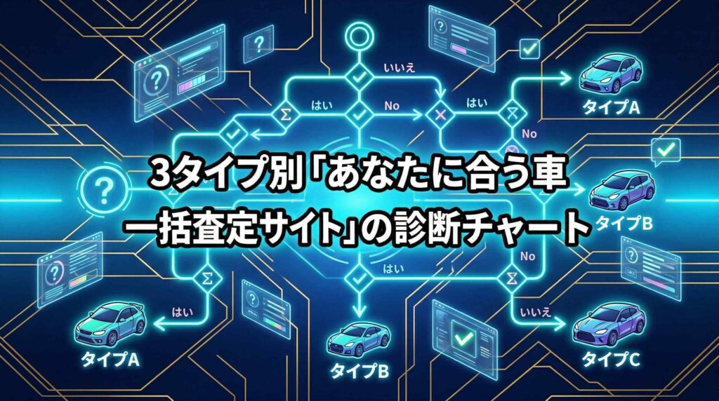 車一括査定サイトは「通常型」「事前査定型」「オークション型」の3タイプに分かれており、あなたの優先度によって選ぶべきサイトが変わります。